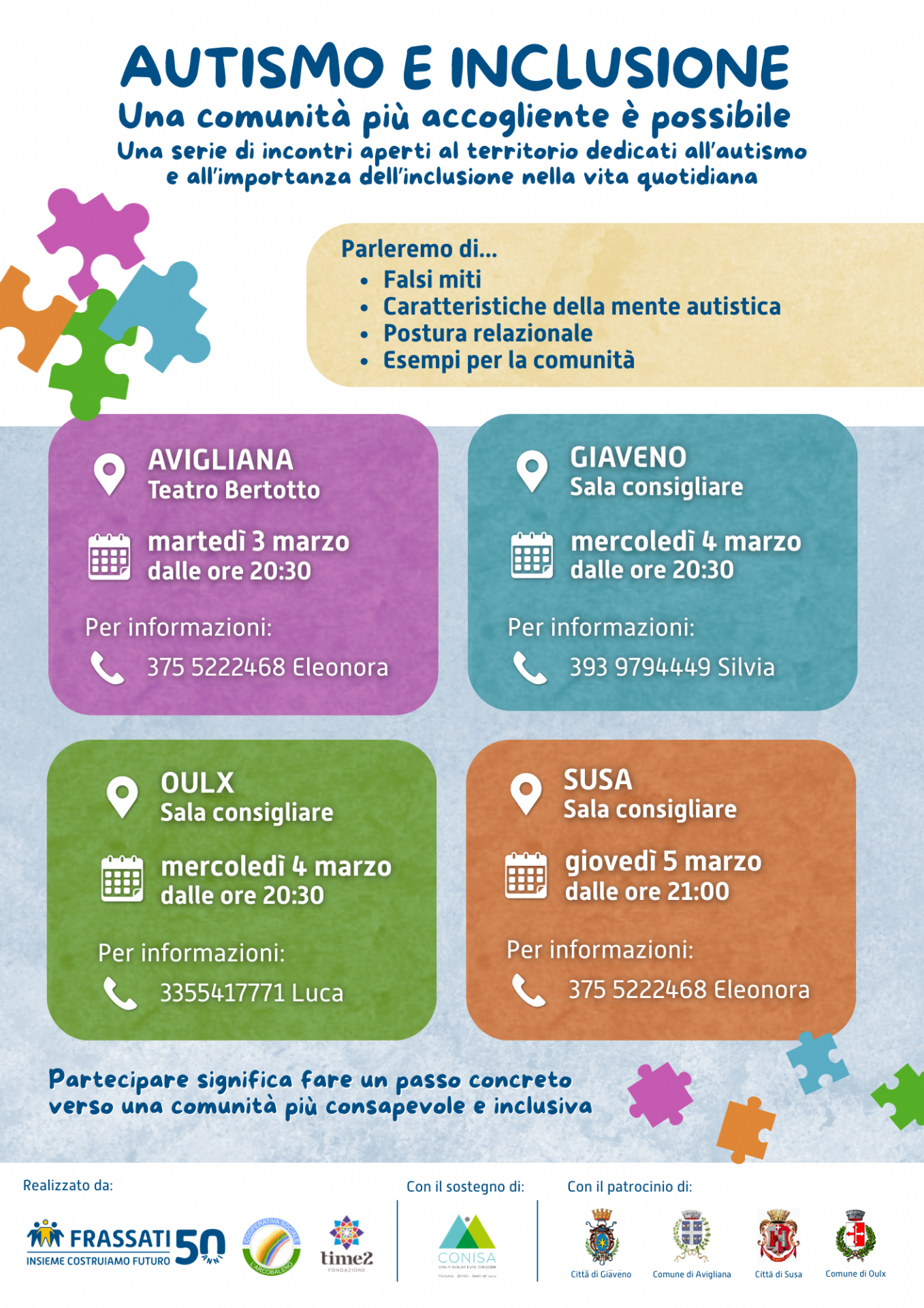 La Cooperativa Sociale P.G. Frassati insieme alla Fondazione Time2 organizza una serie di incontri aperti al territorio dedicati all'autismo e all'importanza dell'inclusione nella vita quotidiana. Durante gli incontri si parlerà di: