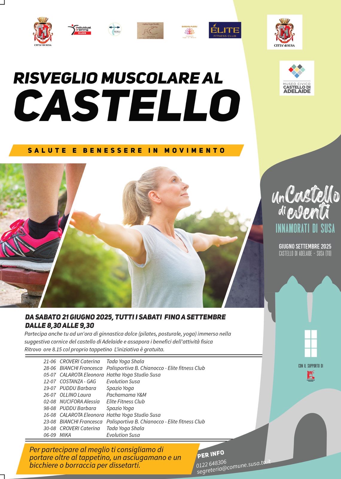 E' consigliato portare tappetino, asciugamano, bicchiere o borraccia per dissetarsi.