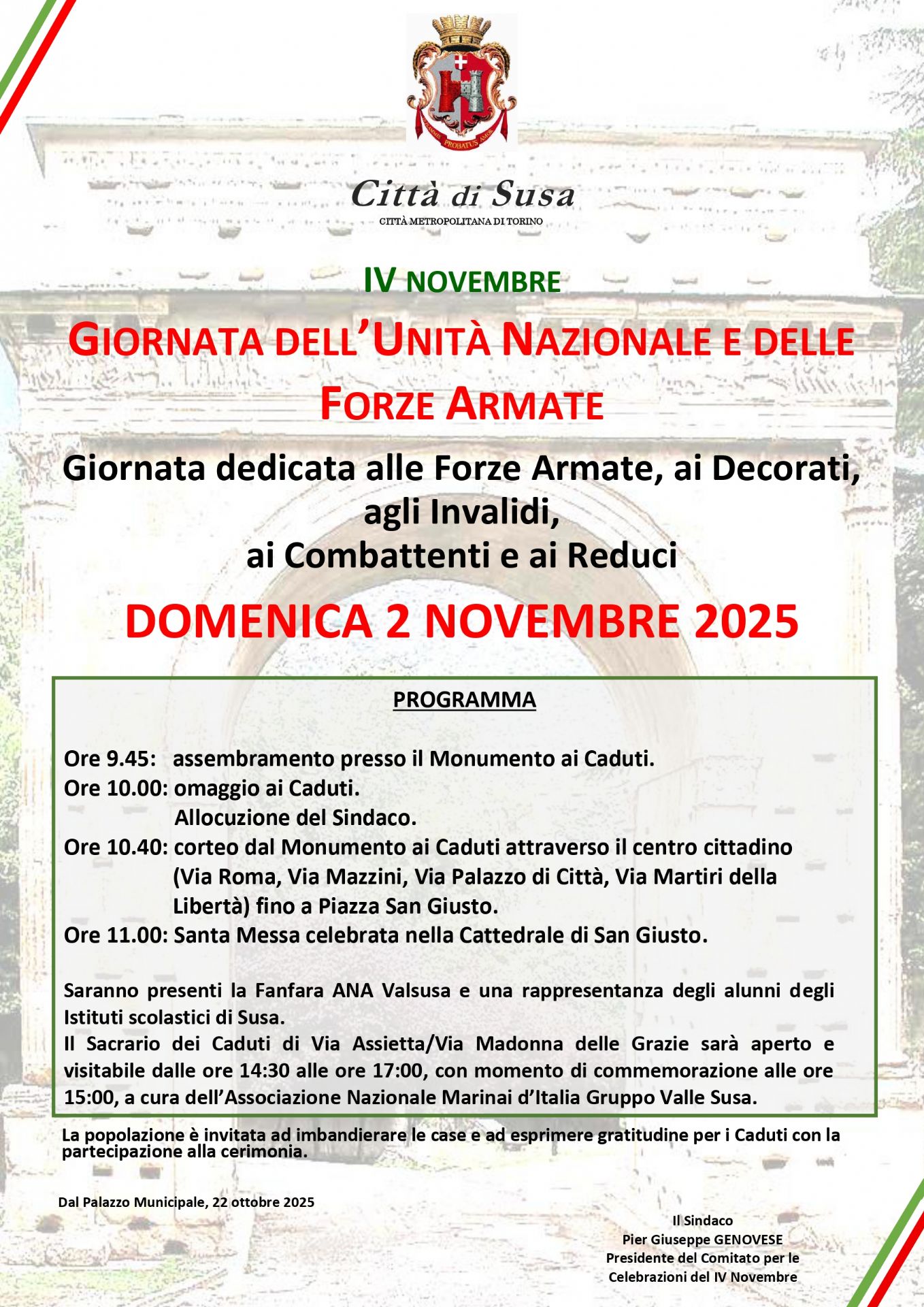 Saranno presenti la Fanfara ANA Valsusa e una rappresentanza degli alunni degli alunni degli Istituti scolastici di Susa.