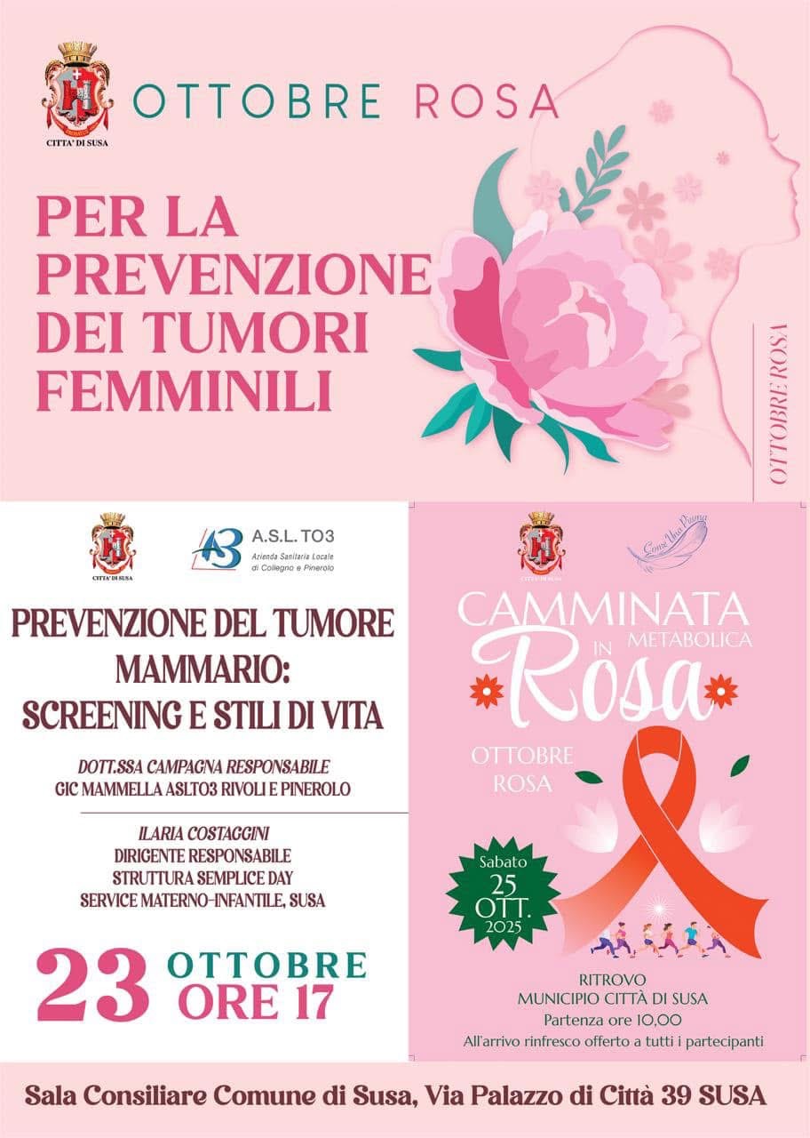 - sabato 25 Ottobre Camminata metabolica in Rosa: ritrovo presso municipio Città di Susa, partenza alle ore 10:00, al rientro rinfresco per tutti i partecipanti.