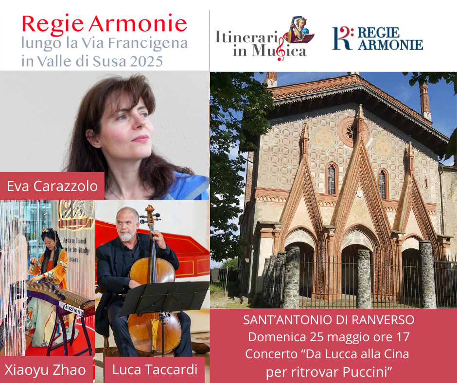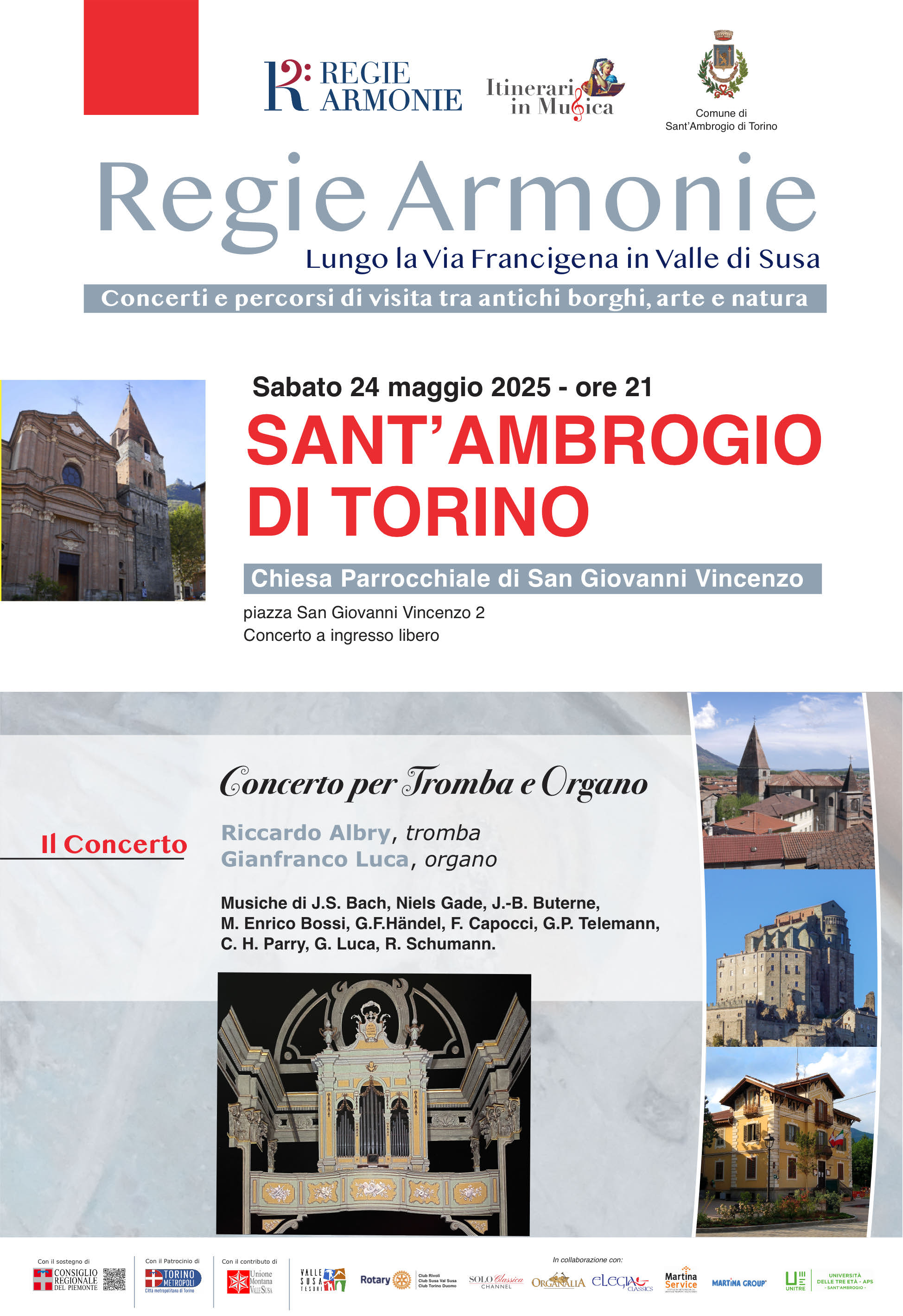 Ripartiranno sabato 24 maggio, a Sant’Ambrogio di Torino, e domenica 25 a Buttigliera Alta i concerti dell’edizione 2025 di “Regie Armonie Lungo la Via Francigena”: appuntamenti musicali e percorsi di visita tra antichi borghi, arte e cultura. Un progetto di Itinerari In Musica per valorizzare e riscoprire il patrimonio storico, artistico e culturale del territorio in modo inclusivo e adatto ad un pubblico ampio e variegato.